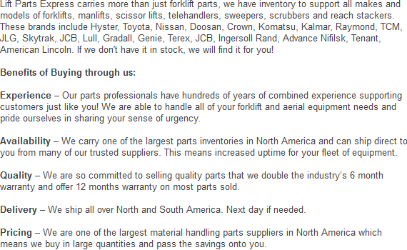 For your entire fleet of forklifts, we offer the best deals on all our parts. If you are interested in getting a quote for our parts or attachments, give us a call now at: